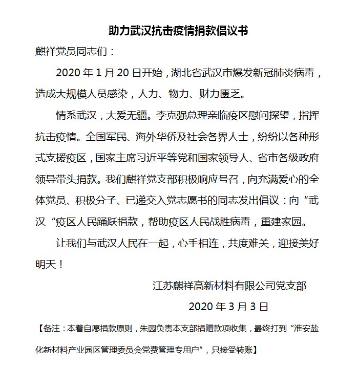 疫情當前,愛心無限。2020年3月3日,是麒祥集團全面復工的第二天,董事長姚翔同志和江蘇麒祥高新材料有限公司黨支部書記彭華龍同志即號召集團全體黨員、積極分子,并帶頭為支持新冠肺炎疫情防控工作捐款,充分發揮黨員模范作用,以實際行動踐行初心使命,為打贏疫情防控阻擊戰貢獻力量。