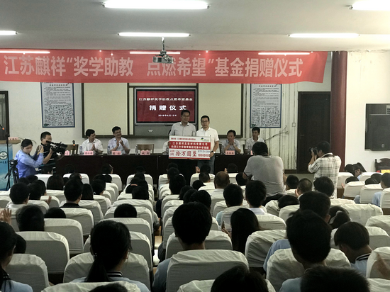 江蘇麒祥高新材料有限公司董事長姚翔代表江蘇麒祥向淮安范集中學捐贈10萬