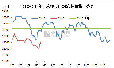 本周國內乳聚丁苯橡膠主流市場報價重心走高。截至周四,山東地區齊魯丁苯1502E主流報價11600元/噸,較上周收盤價格漲5.45個百分點。本周山東地區齊魯丁苯1502E均價11440元/噸,環比上周均價漲幅3.25%,同比去年同期走低8.08%。周內,銷售公司對丁苯橡膠供價累計上漲300元/噸,然相關產品滬膠、原料丁二烯走勢均偏弱,操盤商對丁苯市場行情預期操盤商難言樂觀,謹慎思路明顯,多試探性報盤,實單商談。然終端用戶買氣平淡,業者整體出貨存有壓力,行情走勢僵持。