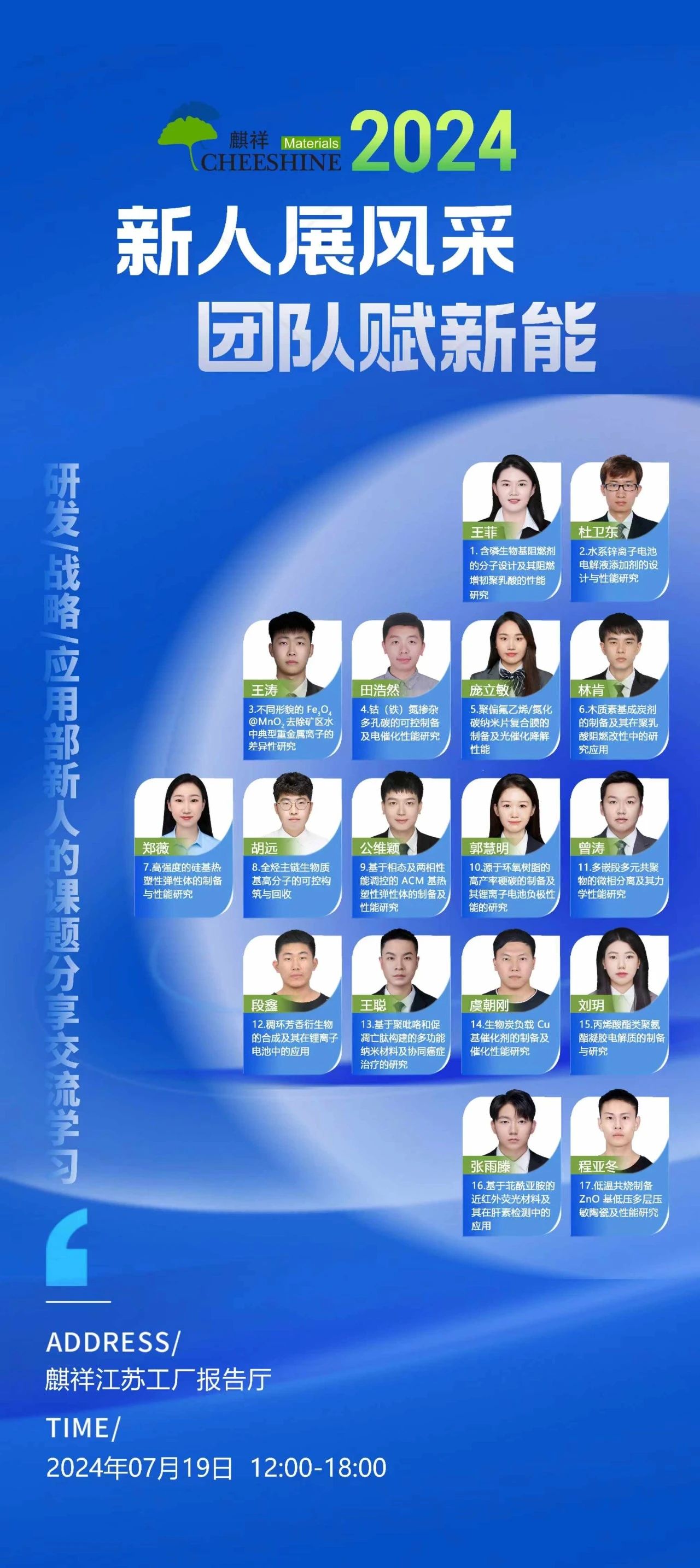 為激發新人的科研熱情,促進麒祥新材料內部創新,公司迎來了一場別開生面的學術盛宴。這次活動以“新人展風采-團隊賦新能”為主題,在不涉密前提下,分享新人碩博的研究框架,激發創新思維,為公司的未來高速發展注入源源不斷的新動力。